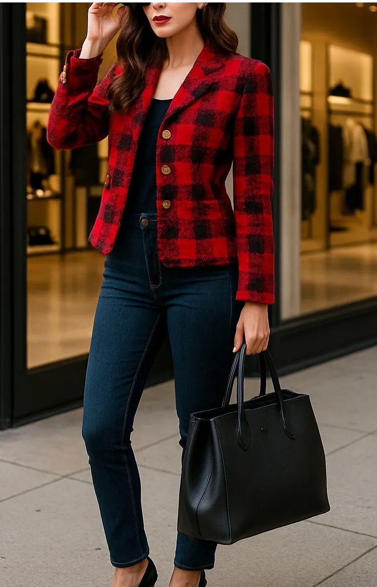 Vintage Brand: Santa Fe by Jim Tremblay Style: Tweed Button Front Blazer Color: Red & Black Check Buttons: Gold woven crest buttons Fit: Structured, elegant, shoulder pads Lined: Yes Made in USA Measurements (flat approx): Pit to pit: 18" Length: 24" Sizing Note Tag size 14 (vintage sizing – runs small). Best fits modern size Medium. Please refer to measurements for best fit. Good pre-owned condition — no flaws. Clean and well kept. luxury textured tweed beautifully tailored with subtle fringe trim. Perfect styled with denim for a modern chic look or dressed up with trousers or a skirt. A collectible-quality vintage piece with high-end craftsmanship. designer chic · editorial style · luxury closet · statement jacket · elevated basic · timeless style · power dressing · quiet luxury · rich textures · upscale fashion · Chanel fall winter layering #luxuryvibes #oldmoneyfashion #designerstyle #editorialfit #runwaylook #classywoman #vintageblazer #modernchic #poweroutfit #richaesthetic#chanel aesthetic