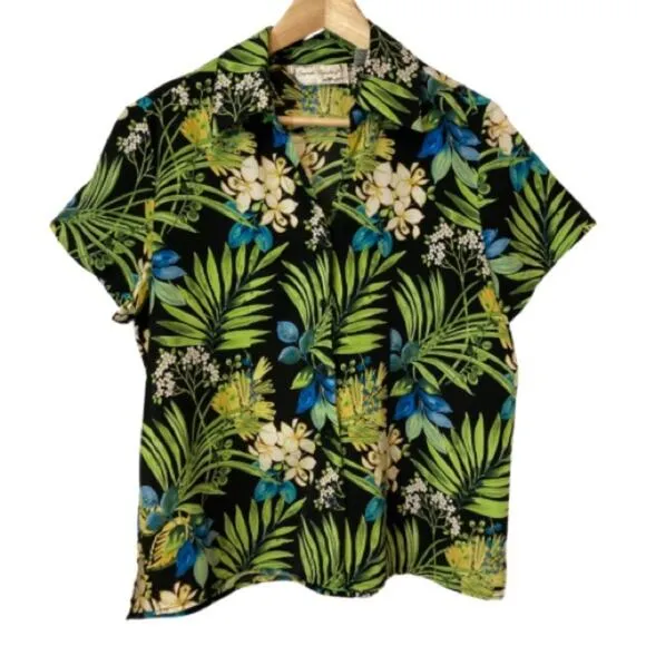 Sarah Bentley Women’s Shirt Button down style top Short sleeves Button front closure V-neck w/ traditional collar Black w/ green, yellow, white, blue tropical / botanical pattern 100% Polyester Size women’s Medium Approx. measurements: Pit to pit: 21.5” Sleeve inseam: 1” Shoulder to hem length: 24” Excellent used condition! Tags: tropical, botanical, plants, flowers, floral, Hawaiian, vacation, beach, cruise, island, coastal, casual, summer, spring, lightweight. SA05