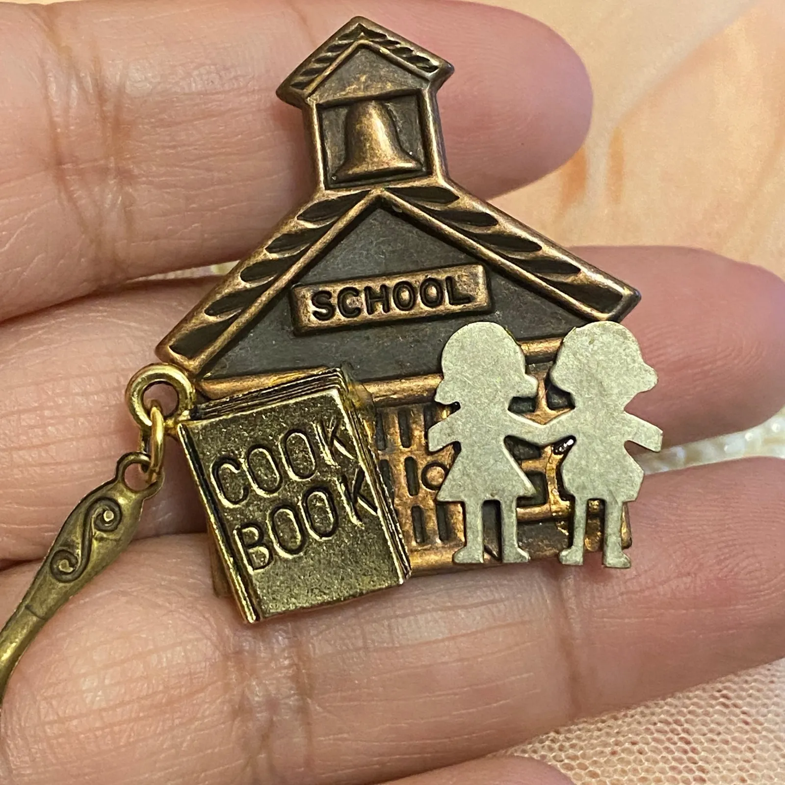 Preloved in excellent condition. Please see all photos for close up details and measurements Measurements: • Approx. 1.25 inch height Type: Brooch Material: Metal Color: Brown Main Stone Color: No Main Stone Main Stone: No Stone Metal: Base Metal Country of Origin: United States Main Stone Shape: Round Setting Style: Prong Cut Grade: Good Keywords: vintage brooch, schoolhouse pin, cookbook charm, teacher gift, student jewelry, novelty pin, antique style, retro jewelry, book lover gift, school themed jewelry, whimsical pin, unique brooch, literary gift, vintage jewelry, charm brooch