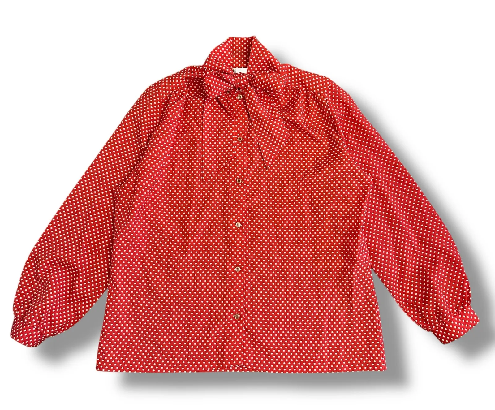 Charming vintage Sears Fashion Place blouse in a bold red with classic white polka dots. Features long puff sleeves with button cuffs, a button-front closure, and a feminine tie-neck (bow) detail. Made of lightweight, silky polyester — perfect for layering, office wear, or retro-inspired styling. • Brand: Sears Fashion Place, Style 64843 • Size: 38 (fits like Women’s Medium; please refer to measurements) • Fabric: 100% Polyester • Made in USA Measurements (approx.): • Pit to pit flat (chest): 23” • Length (shoulder to hem): 26.5” • Sleeve length: 24” Vintage, excellent condition for age. Light stain on inside of collar, see photos. No holes or major flaws. Fabric is vibrant with only minor vintage wear.
