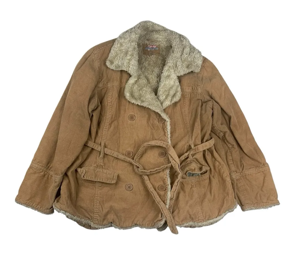 y2k Seventy7 corduroy jacket. women's size 3x. Good used condition, front pockets inner liner is torn. Stylish brown jacket with faux fur lining. Features a belted waist and button details.