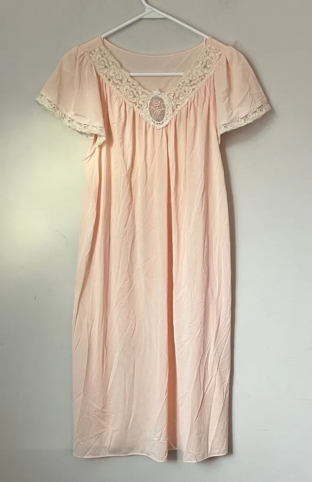 P2P 22” Length 37.5 Dreamy vintage Shadowline nightgown in the prettiest blush pink with romantic lace trim, embroidered floral detail, and flutter cap sleeves. Flowy, lightweight, and ultra feminine — perfect for cottagecore lovers, coquette vibes, bridal getting-ready, boudoir looks, or vintage lingerie collectors. ✨ Authentic vintage sleepwear ✨ Soft pastel pink with cream lace ✨ Classic Shadowline quality & drape 📏 Size: Small (vintage fit — see measurements if needed) 🧵 Condition: Very good vintage condition Perfect for shoppers searching “vintage pink nightgown,” “lace nightgown,” “coquette sleepwear,” “cottagecore lingerie,” “Shadowline vintage.”