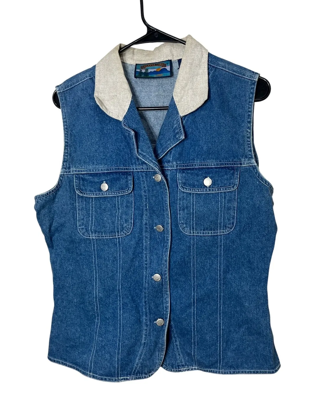 Classic denim vest with a unique, outdoorsy touch. This medium-wash blue denim vest features a contrasting tan collar and a full button-down front with silver-tone buttons. Two functional chest pockets add utility, while the detailed stitching provides a tailored look. Some staining along the collar shown in pics Type: Vest Outer Shell Material: Cotton Style: Basic Jacket Department: Women Color: Blue Lining Material: Cotton Fabric Type: Denim Features: Collared, All Seasons, Inner Pockets Accents: Button, Logo Pattern: Solid Season: Fall, Spring, Summer Closure: Button Occasion: Casual Keywords: denim, cotton, western, vintage, casual !!!Please See Measurements vintage sizes run smaller than modern sizes!!! Measurements Length: 22 1/2 inches Pit to Pit: 20 1/2 inches