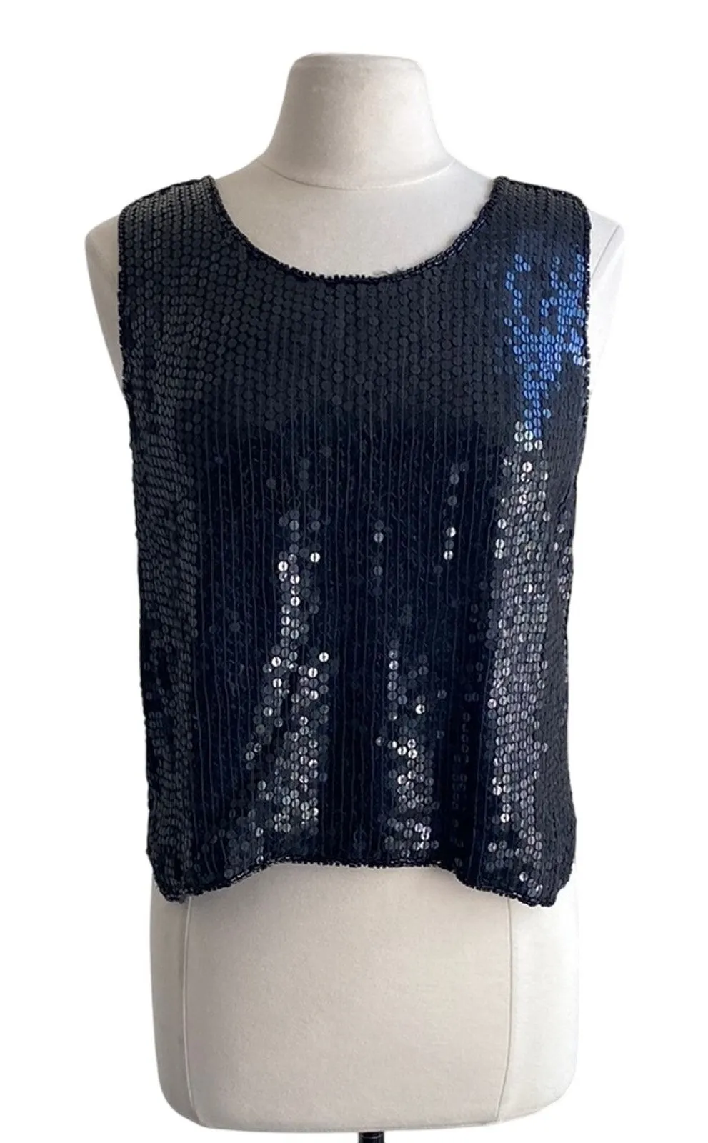 VINTAGE Shimmer Black Sequin Tank Womens Sz Medium Glam Cocktail Party Very gently used - excellent condition Pull over Full body length 20.5” Across chest 19.5” 100% Silk Shine in this elegant black sequin sleeveless top. Perfect for a night out or special occasion.