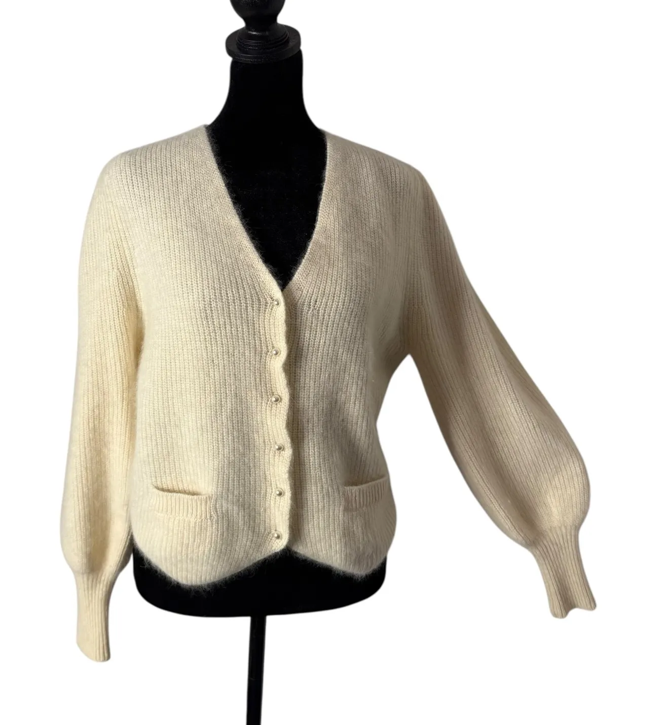Vintage Sideffects Fuzzy Cardigan Sweater Womens Size M Cream Balloon Sleeve Cozy Knit Front Open Pockets Pearl Buttons ***Flaw Repair - Circled in Red Angora (Rabbit Hair) Lambswool Nylon Pre Owned, In Great Shape No Holes or Stains ****Measurements are Located in Photos Pet Free Smoke Free