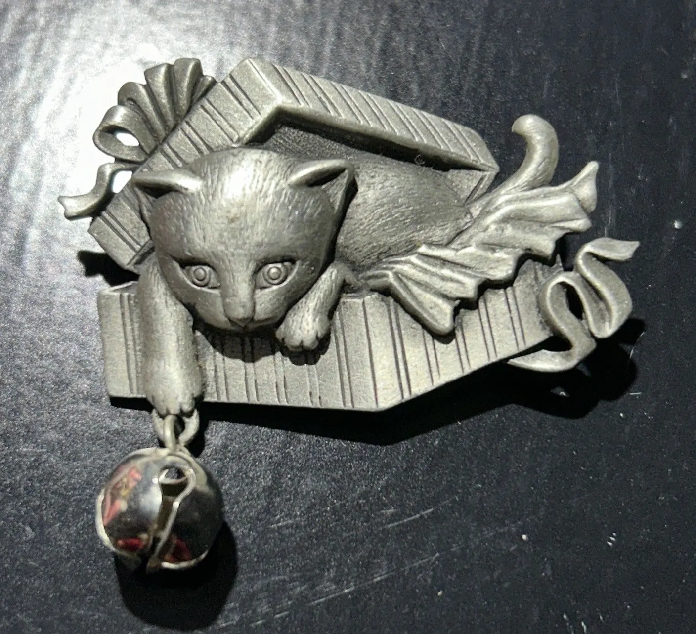 Vintage Signed JJ Silvertone Cat Holding Jingle Bell in Christmas Present Brooch Silver - $10 - From Hannah