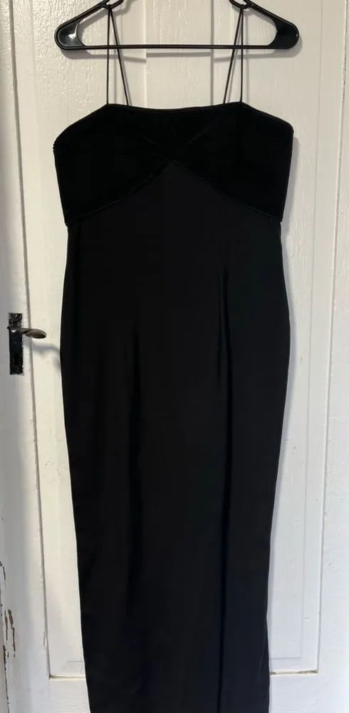100% Silk little black dress Thin silk sewn in straps Folded ruched bodice Front seaming Back zip with single hook and eye closure Back slit Very good preloved condition no holes or major visible staining Zipper does not fully reach hook and eye shown in pictures Smoke Free Dog Friendly Home Please be aware to expect a slight variation in color due to lighting and your device screen settings . Bin 17