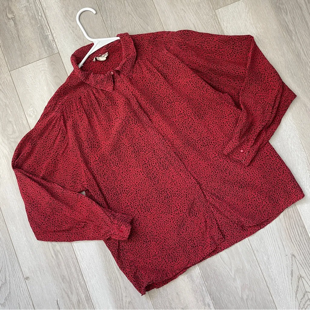 Alan Austin Silk Button Up Shirt in the color Red and black. Micro animal print / dotted print. Stand collared, long puff sleeve, gathered yoke, button up shirt. Lightweight, breathable fabric. Size 4, womens. In great pre-worn condition, no major issues. Materials has rubbed off but based on feel, is 100% silk. Super cute vintage, retro, chic, minimalist, office, work, party, romantic, printed, fun style. //C486, 3.6