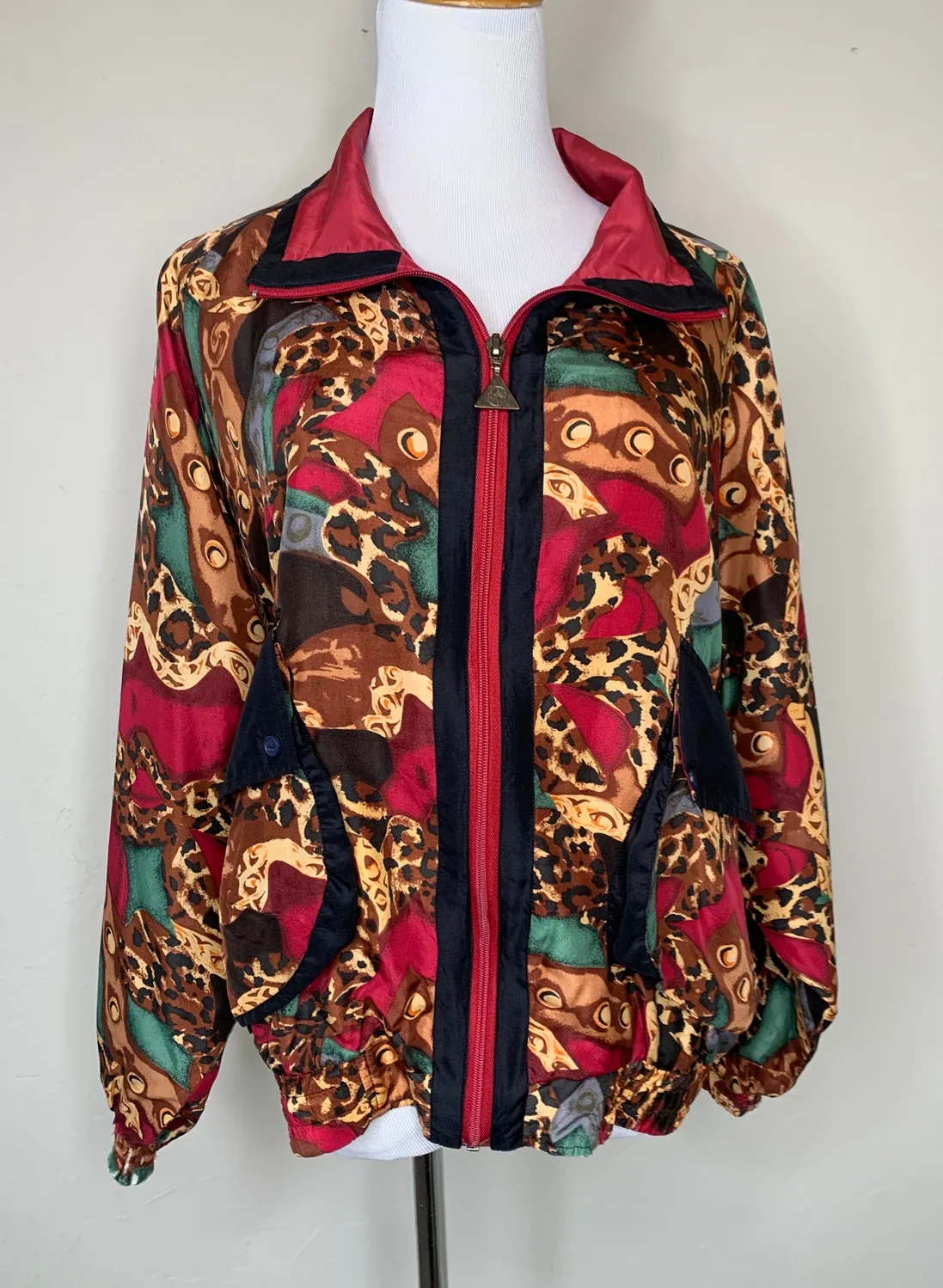 Vintage Silk Track Jacket Y2k 90s Boho Indie Sleaze Streetwear Sz Small front flap pockets Deep Burgundy, brown, black, green, gray Leopard and geometric abstract design very unique design one of a kind Brand is casual Isle Measurements laying flat approximate : bust: 26" length: 23.5" sleeve: 31" D2-27