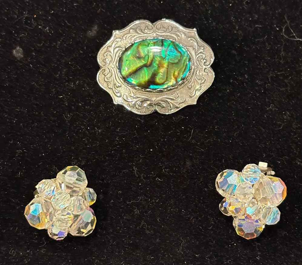 This exquisite vintage jewelry set features a stunning silver brooch with a vibrant green abalone centerpiece, complemented by elegant crystal earrings. Perfect for adding a touch of sophistication to any outfit.