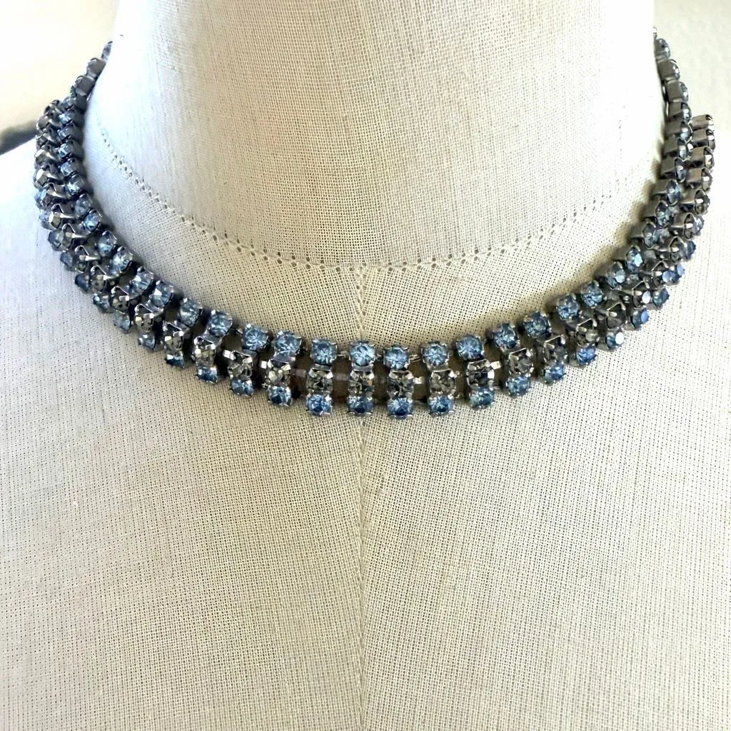Silver Tone Blue & Smoke Rhinestone Triple Row Necklace Elegant vintage statement necklace featur... Show more