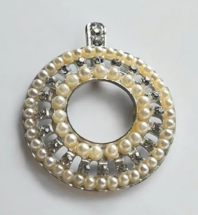 This vintage silver-tone pendant boasts faux pearls and rhinestones in a circular halo design, offering timeless elegance. • Material: Silver-tone metal • Size: Diameter approximately 2 inches • Condition: Pre-owned, light age-appropriate wear #VintagePendant #PearlJewelry #RhinestoneJewelry #VintageJewelry #SilverTone #RetroStyle #ClassicJewelry #StatementPendant #CostumeJewelry #VintageFind