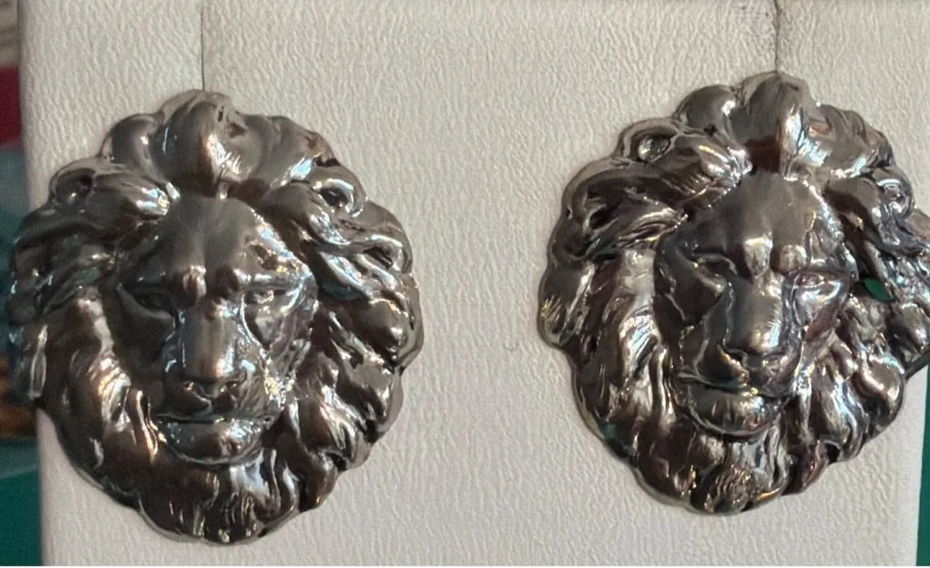 Elevate your style with these vintage silver tone lion head earrings. Featuring intricate texture and a bold design, they make a statement while remaining lightweight at 5.29 grams. Perfect for adding a unique touch to any outfit. • Vintage silver tone finish • Lion head design • Textured detail • Pierced earrings • Lightweight at 5.29g • Estate piece Excellent preowned condition
