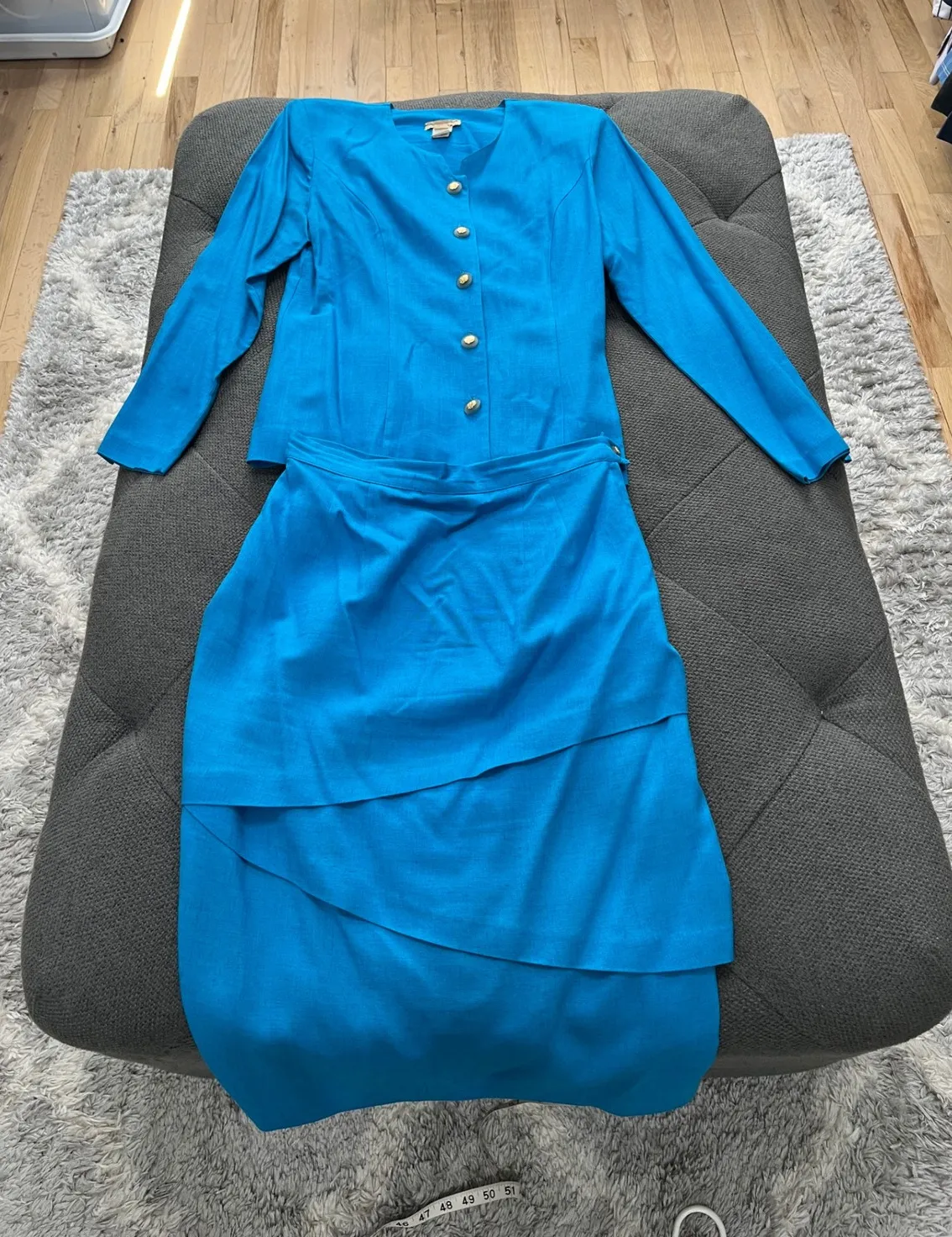 Elegant vintage skirt suit, a sophisticated ensemble perfect for making a statement. This set features a tailored blazer-style jacket with distinctive gold-tone buttons, paired with a unique tiered skirt. The skirt boasts a flattering silhouette and eye-catching design. The jacket is size 8 and the skirt is size 10. Ideal for a formal business meeting, a special occasion, or a stylish daytime event. Decade: 1980s Material: 80% Rayon 20% Linen Size (Women's): 8 blazer / 10 skirt Fits like a size 4/6 Style: Skirt Suit Color: Blue Keywords: vintage skirt suit, rayon linen suit, tiered skirt, gold button suit, formal skirt suit, business suit, vintage clothing, skirt set, womens suit, size 8 skirt suit, size 10 skirt suit, special occasion suit, retro suit, 80s suit Smoke free dog loving home