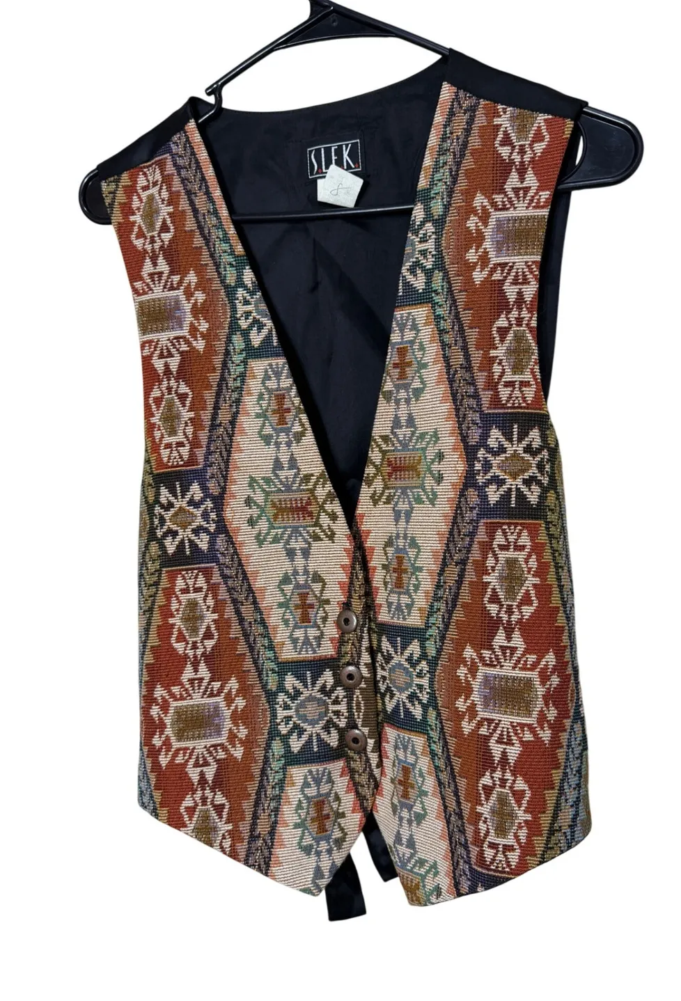 Sleek tapestry vest in a Southwestern geometric print. This sleeveless vest features a black lining and a tie closure at the back. The front showcases a vibrant diamond pattern in earthy tones of rust, cream, blue, and green. Tag says one size but it measures a size M Type: Vest Outer Shell Material: Cotton Blend Department: Women Lining Material: Acetate Pattern: Geometric Season: Spring, Summer, Fall Closure: Button, Tie Occasion: Casual Sleeve Length: Sleeveless Fit: Regular Garment Care: Dry Clean Only Keywords: tapestry, geometric print, Southwestern style, boho vest, vintage, layered look, statement piece, unique print, outerwear, fashion vest !!!Please See Measurements vintage sizes run smaller than modern sizes!!! Measurements Length: 22 in Pit to Pit: 19 1/2 in