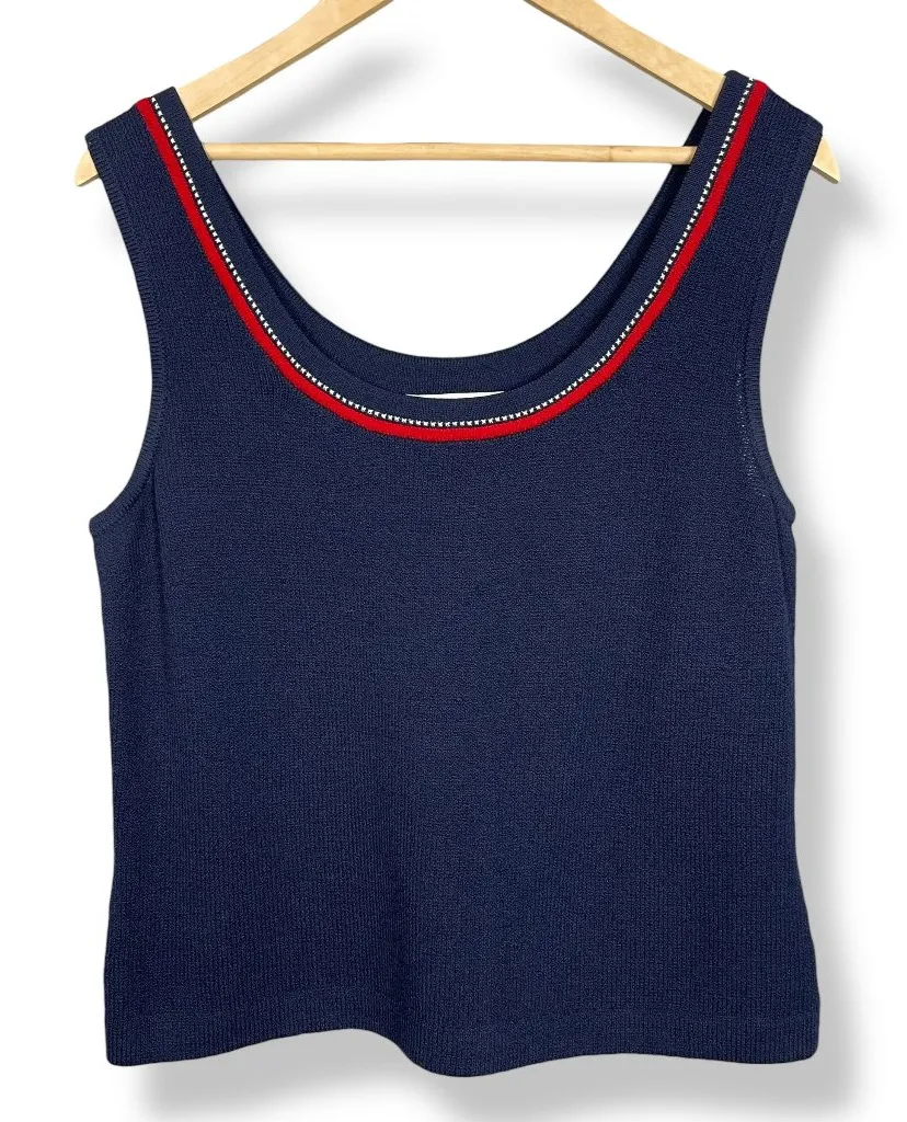 Vintage St. John women's knit tank top in navy blue with red and white trim. Cruise 03, Group 1 Con... Show more