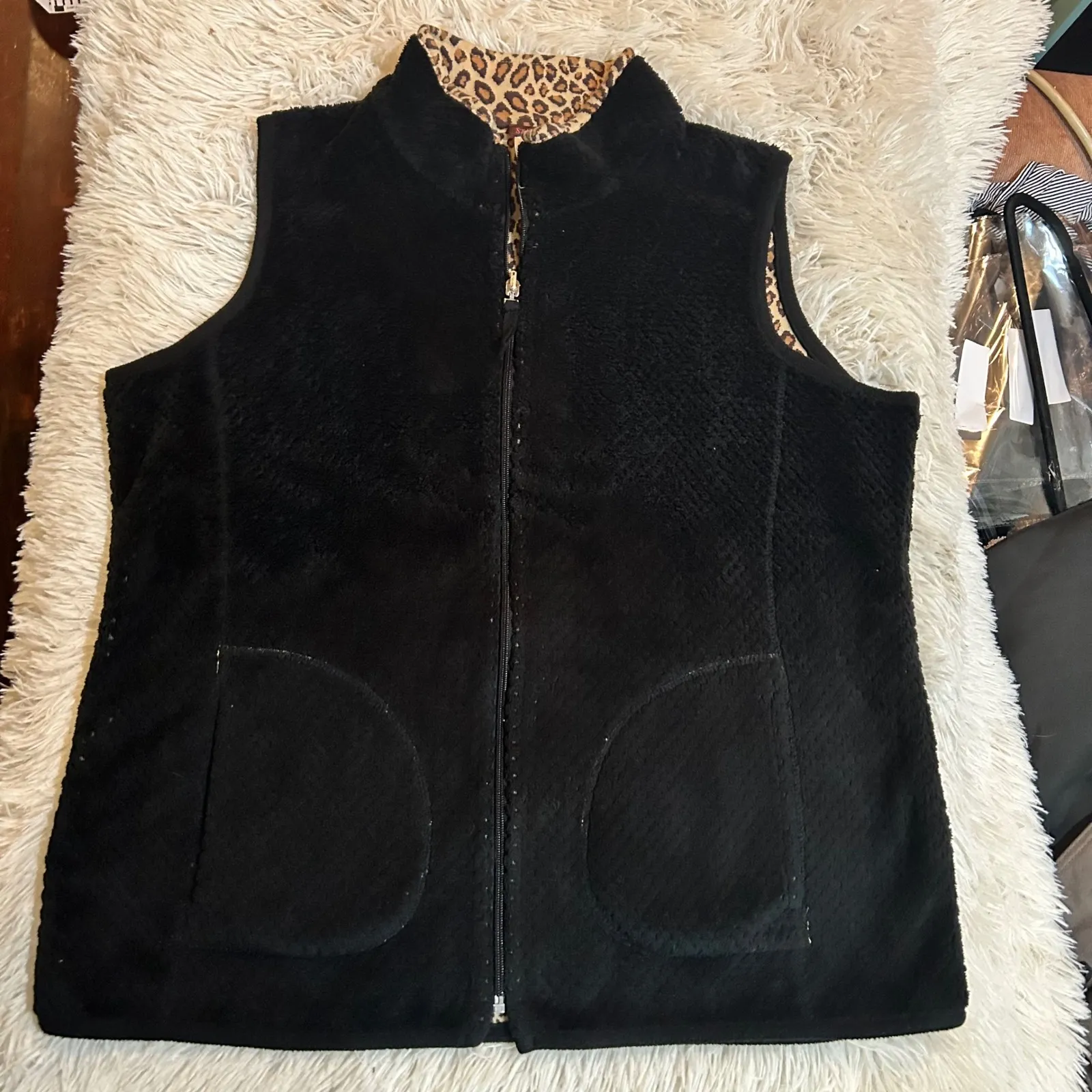 True to size. Not much stretch. Pockets! Super soft. Excellent condition. Cozy and stylish fuzzy fleece vest featuring a trendy leopard print trim. This sleeveless vest offers a full zip closure and a flattering silhouette with functional pockets. Its soft texture and warm construction make it an ideal layering piece for cooler weather. Perfect for adding a touch of sophistication to casual outfits, whether you're running errands, meeting friends for coffee, or enjoying a brisk autumn walk.