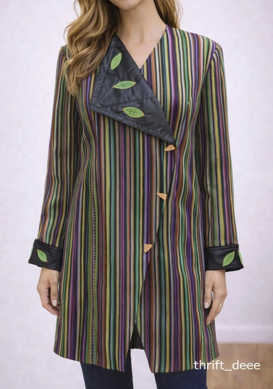 Excellent pre-owned condition with no visible stains, holes, or damage. All buttons intact and fabric presents beautifully. A striking statement jacket featuring bold vertical stripes with metallic accents for a dramatic, artistic look. Designed with an asymmetrical collar and decorative buttons, this piece elevates any outfit effortlessly. Features: Multicolor vertical stripe design Metallic thread detailing throughout Asymmetric lapel collar Long sleeves Decorative novelty buttons Fully lined interior Measurements (Approximate): Pit to pit 27.5” Length 33.5” Care & Fabric Notes: Shell: 90% Polyester, 10% Metallic Lining: 100% Polyester Care: Dry Clean Open to offers/bundles. All orders ship next business day. Questions/ comments welcome! boho, artistic, statement jacket, metallic stripe, retro fashion, bold layering, plus size fashion G5