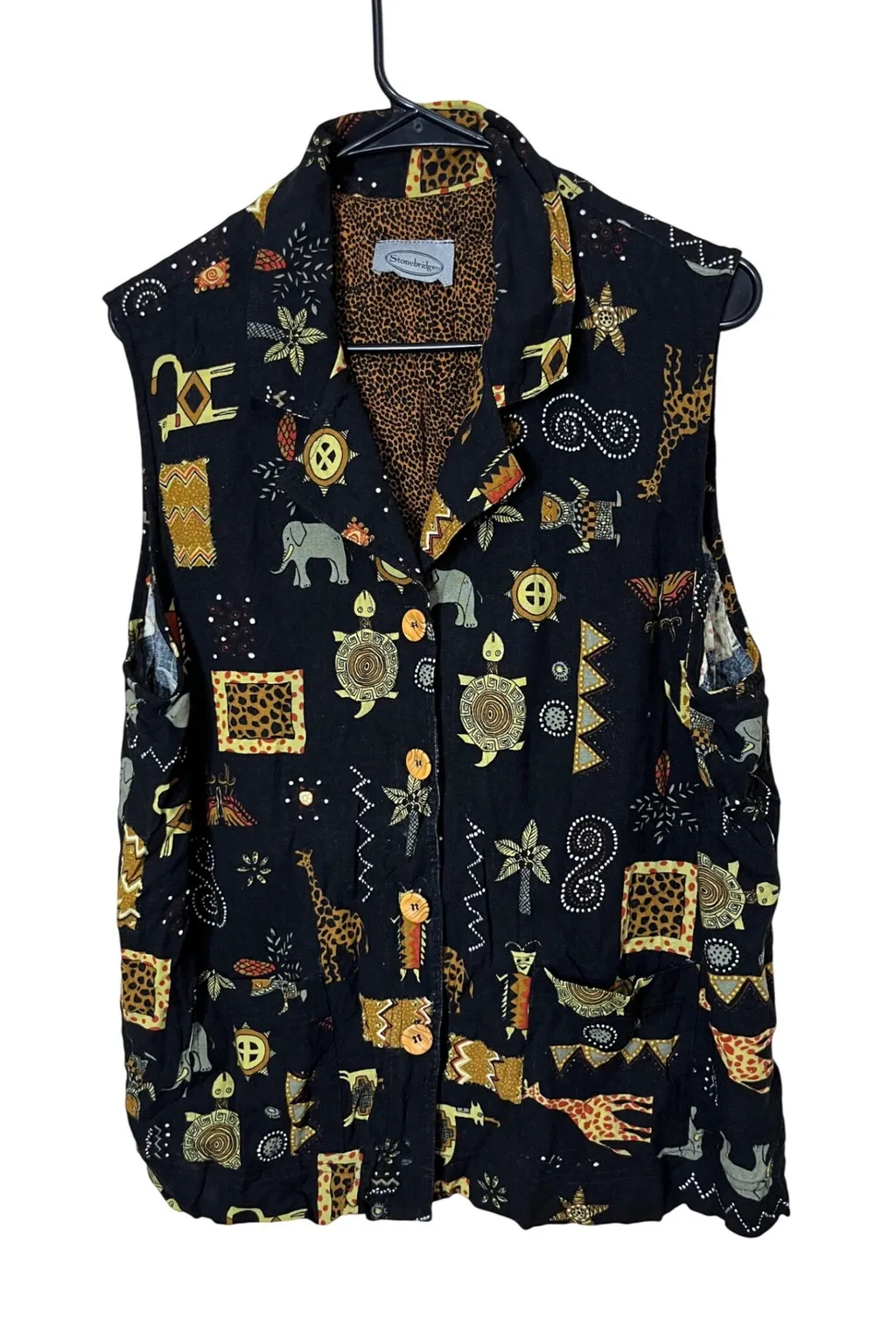 Stonebridge vest featuring a unique safari-inspired print. This sleeveless top showcases a captivating array of African animals and motifs, including elephants, giraffes, turtles, and abstract patterns in black, gold and brown tones. The vest is designed with a collared neckline, button-down front, and a contrasting leopard print lining, adding a touch of wild sophistication. It also features two front pockets, blending style with functionality. No size tag see measurements measures around a size XL Type: Vest Outer Shell Material: Cotton Lining Material: Cotton Theme: Animals Fabric Type: Rayon Pattern: Animal Print Season: Spring, Summer, Fall Occasion: Casual Keywords: safari, animal print, bohemian, vintage, statement !!!Please See Measurements vintage sizes run smaller than modern sizes!!! Measurements Length:25 1/2 inches Pit to Pit:24 inches