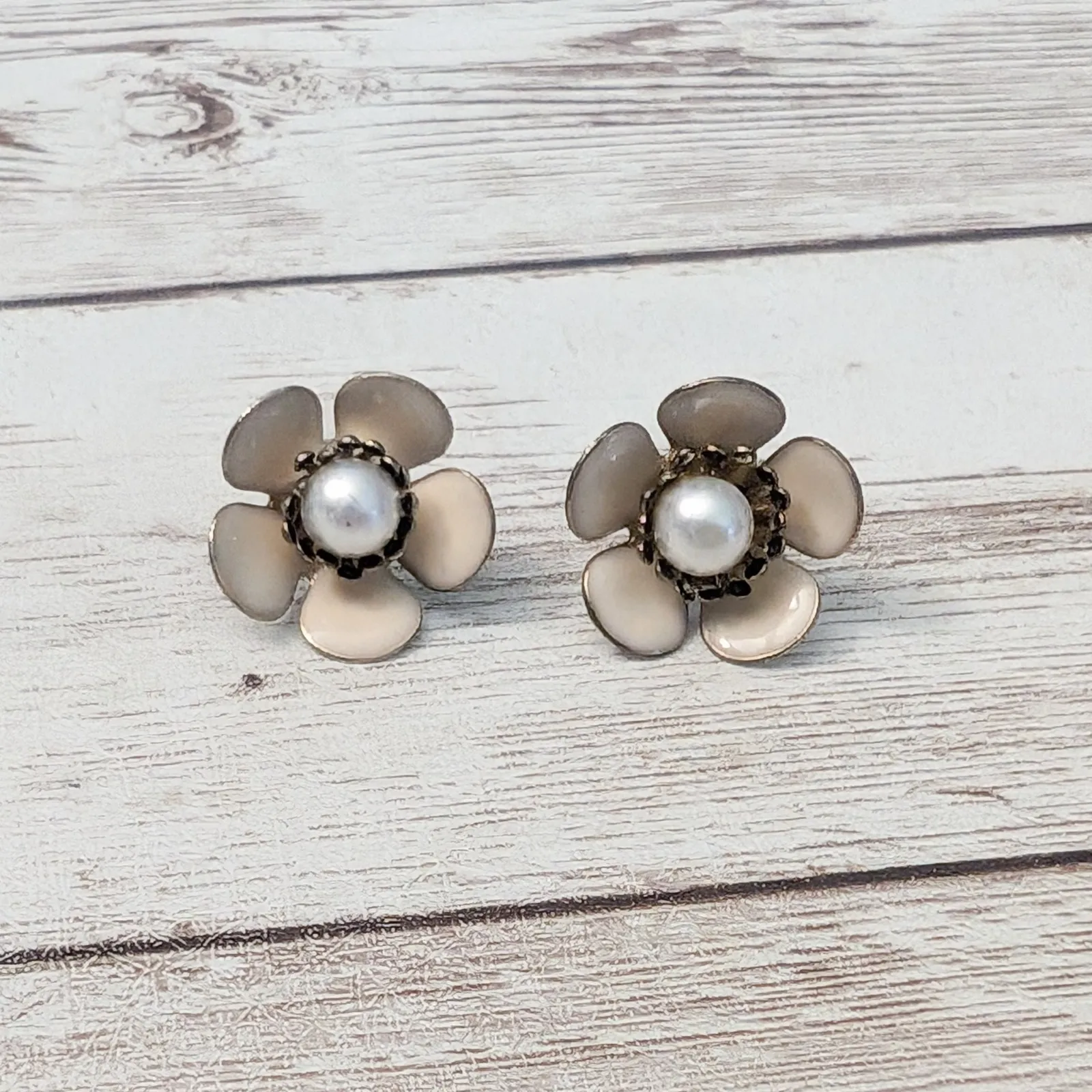 These earrings measure about 5/8". No earring backs included. Some light signs of wear to studs. Tarnish and marks to rear. Some wear/chipping to faux pearls. One stud a little bent. Petals are covered in a cream enamel. Preowned vintage earrings, sold as shown - I am unsure of material type(s) because of this. Pictures show different angles for you to review - while I attempt to note any defects, some tarnish/signs of wear may be visible that are not otherwise stated. If you have any questions please feel free to drop me a message.