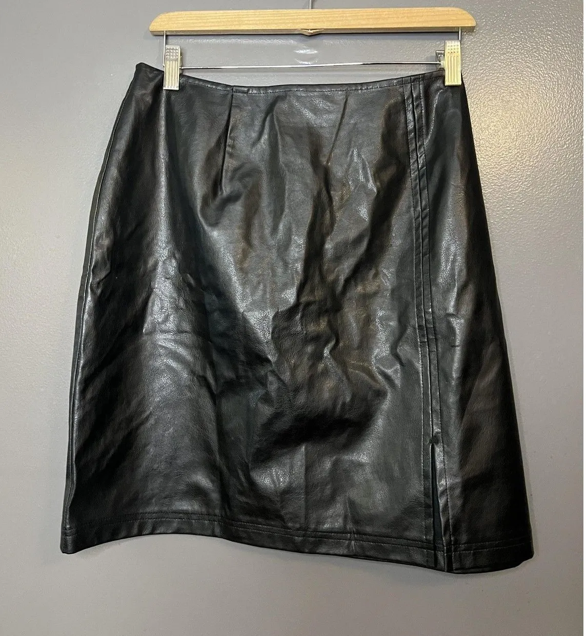 Pre-owned skirt with light overall wrinkling and creasing to the faux leather from wear and storage. Fabric and lining are clean and intact with no cracks, peeling, or stains. Back zipper works properly and slit and seams are secure. Brand: Vintage Studio Type: Womens straight/pencil skirt in black faux leather with a knee-length cut. Color: Black; Pattern: Solid. Size on tag: 14 (Womens regular). Materials (per tag): 75% PVC, 20% polyester, 5% polyurethane; faux leather outer with smooth lining. Details: Back zip closure, front and back darts for shaping, small front hem slit, fully lined interior, sleek minimalist style suitable for work or going out. Care instructions (per tag): Dry clean recommended or wipe down with a damp cloth when needed. Additional tag information: RN 52438, Style 0030, Made in China. Waist 31" Length 20.5" bin 100 2390