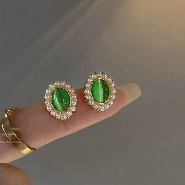 Add a touch of vintage elegance to your jewelry collection with these exquisite cat eye stone earrings. Featuring a classic oval-shaped green cat eye stone, these earrings are surrounded by a delicate ring of pearls, making them perfect for adding a graceful touch to any outfit. Key Features: • Design: Vintage-style cat eye stone with a pearl border. • Material: High-quality S925 silver posts for comfort and durability. • Style: Timeless, elegant, and suitable for everyday wear or special occasions. • Size: Small and lightweight (as shown in photos for reference). • Color: Rich green cat eye stone.