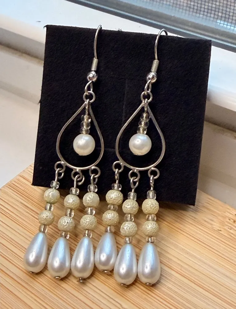 These teardrop earrings feature faux pearls and gold beads, offering a sophisticated touch for formal or professional settings. Lightweight and easy to wear. • Wire hook fastening for secure wear • Approximate length: 3 inches • Faux pearl and gold bead accents • Elegant teardrop design • Lightweight metal frame Earrings measure approximately 3 inches in length. No visible flaws or damage.