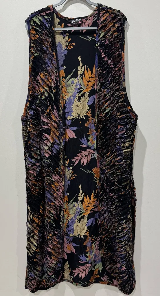 Black and floral Excellent condition No size measures approximately to 27 x 55 inches Lagenlook, Relaxed, Artsy, Art to Wear, Statement Piece, Unique, Artisan, Wearable Art, Abstract, Artistic, Earth Tones, Eclectic, Fiber Art, Boho, Bohemian, Hippie