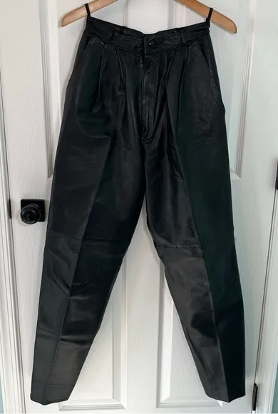 Vintage Suedeclub pleated leather pants in excellent condition. No size tag, but the waist measures 26”, inseam is 31.5” and rise is 13.75”. One of the back pockets is missing the button that shows on the outside of the pocket, but the inside one is still attached. Made in England!