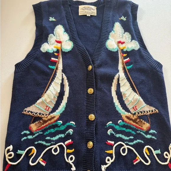 . The Vintage Susan Bristol Vest is a women's navy nautical sweater featuring a sailboat pattern and... Show more