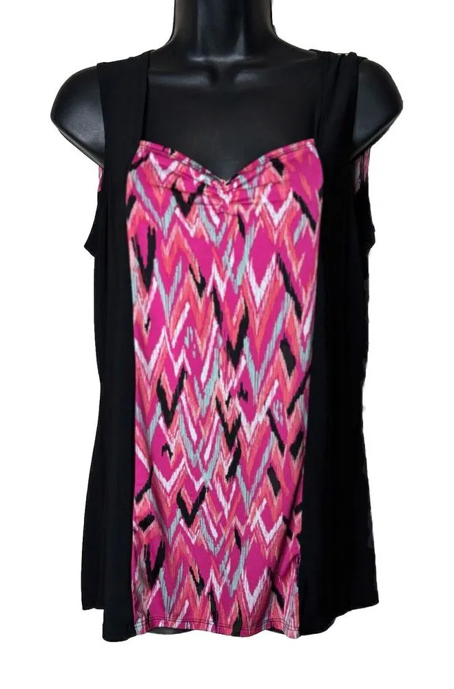 This vintage Suzie blouse is a must-have for any fashion-forward woman. The sleeveless design and sweetheart neckline add a touch of elegance, while the strappy sleeves and colorful zigzag pattern give it a playful vibe. The blouse is made from a lightweight, breathable fabric that stretches to fit all body types, making it perfect for any occasion, whether it's a casual day out or a party. The blouse is machine washable and easy to care for, with a pit to pit measurement of 18 inches and a length of 26.5 inches. It comes in a size M and is suitable for women of all ages. Don't miss out on this classic and stylish piece that will make you stand out from the crowd. (1540)