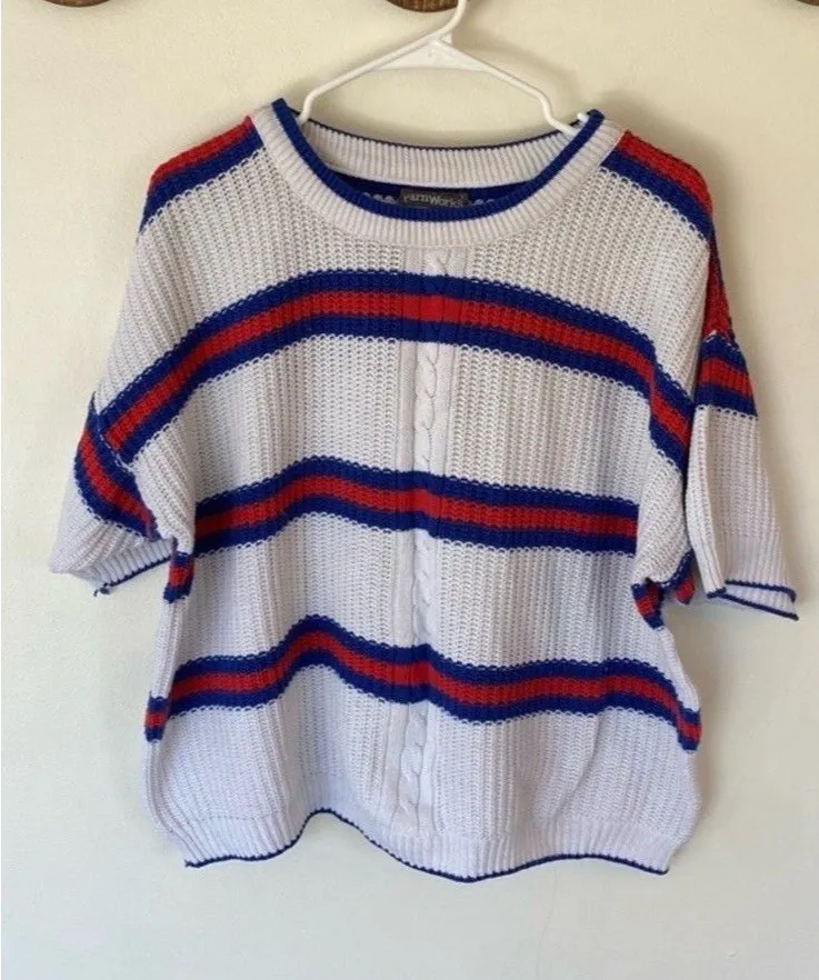 This vintage sweater in red, white, and blue features a patriotic striped pattern in an open-knit style. With short cap sleeves and a relaxed fit, this lightweight cotton sweater is perfect for a cottage core aesthetic. The round neckline and pullover style make it comfortable and easy to wear for game day or casual outings.