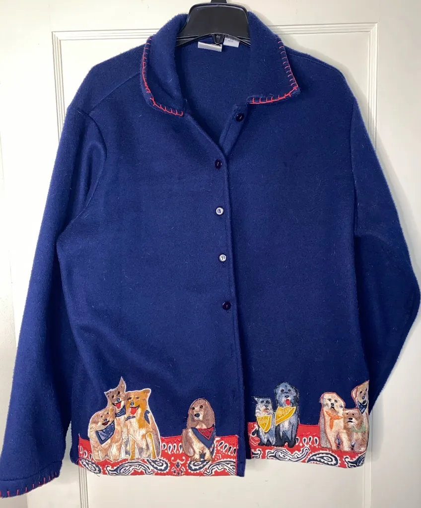 Charming blue cardigan featuring playful dog embroidery along the hem. Perfect for adding a fun touch to your outfit. Vintage Take Two Dog Fleece Jacket Large Womens Western Grandma Blue Button. The cutest dog fleece sweater/coat! Cozy, warm Size: large