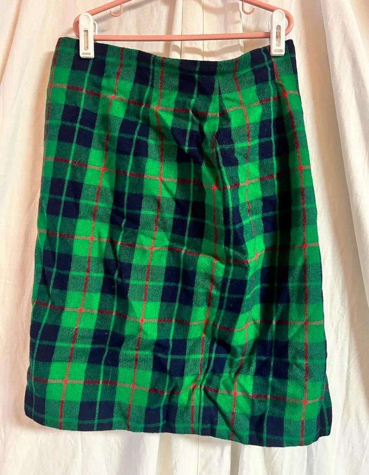 Chic pencil skirt with green and navy plaid pattern. Perfect for a polished look.