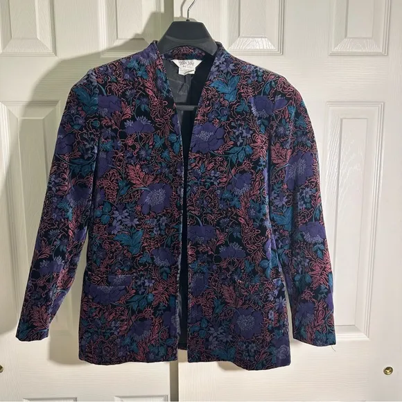 Vintage Tan Jay Floral Velvet Long Line Open Blazer Purple Black Sz 12 gorgeous Floral Black & Purple Print Open style Size 12 28” shoulder to hem 20.5” underarm to underarm Great Preowned Condition ✨ Questions? Drop a comment friend!