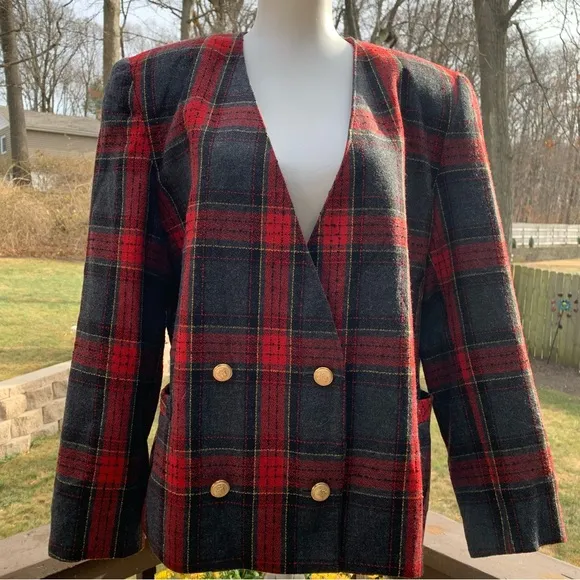 Vintage Tan Jay Red Plaid Tartan Blazer Womens 10 Double Breasted Gold Button Gray - $30 - From T