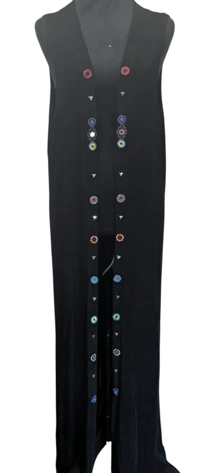 This dramatic vest is the statement piece your wardrobe has been craving. This Vintage Tanuja U.S.A. Duster is a rare find, featuring a flowing, sleeveless maxi silhouette in deep, luxurious black. Notice the striking line of colorful, intricately embroidered buttons and metal stud accents that run down the front—they add a flash of bohemian artistry you will definitely appreciate. Just imagine this piece flowing behind you at a festival or layered over a simple cami and jeans for a sophisticated, Goth Glam look. The long length and unique detailing effortlessly capture the free-spirited nature of the Boho aesthetic. This piece is ready to step into your life and transform your style. Secure this unique vintage treasure now and let your wardrobe's inner magic shine.