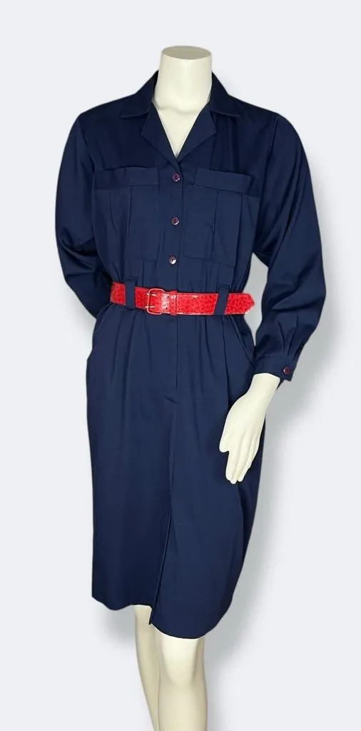 Vintage late 70s/early 80s navy blue Taurus II shirt dress with buttons and a zipper partway down. Bright red reptile-textured belt. Pockets at bust. Elastic at the waistline. Hem falls around the knees. 50% Polyester 50% Rayon. Condition: Gently preloved vintage with imperfectly sewn hook and thread eye at waist, bends in the belt, and stitching added to inner sleeves. Size: 8. See approximate measurements for best fit. Pit to pit: 18.5" Across waist: 12.5" flat to 14"+ stretched Length: 41.5" Cleaned and from a smoke-free home. Fast shipper!