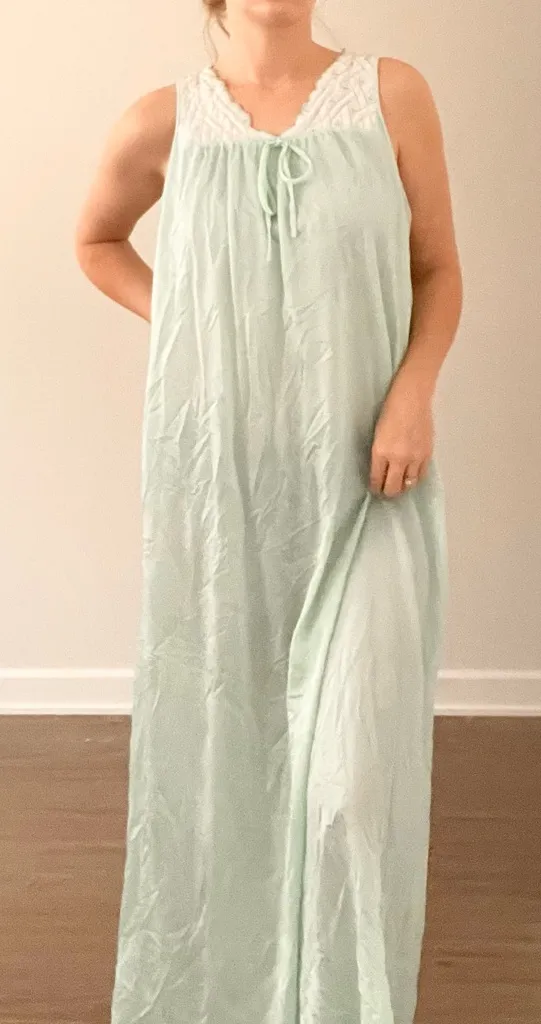 This Vintage maxi dress in a refreshing teal hue features a flowing silhouette perfect for any occasion. The dress is adorned with a delicate lace bodice that adds a touch of elegance and charm. Crafted from a lightweight fabric, it ensures comfort and style throughout the day.