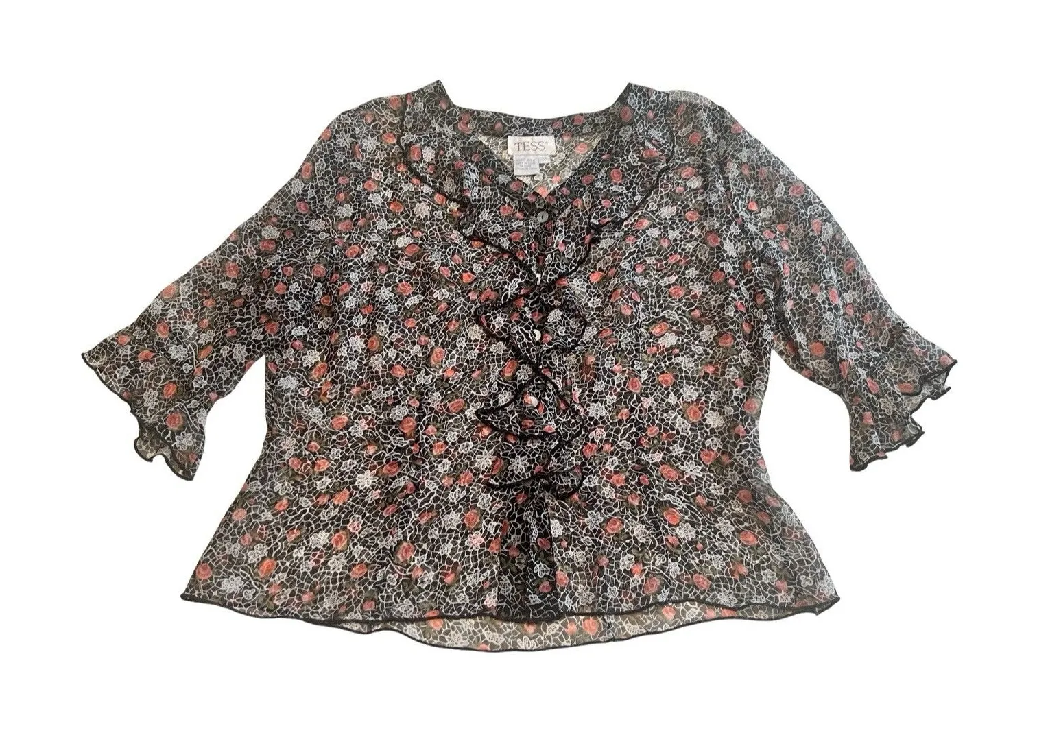 Vintage Tess Women’s 100% Silk Floral Black Red Sz 12 Ruffle Sheer Button‎ Up - $28 - From Sam