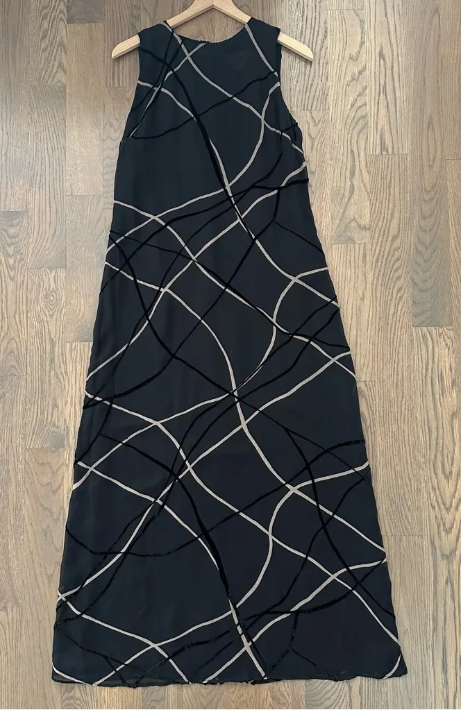 Vintage Tessuto crosshatch textured sheer organza maxi dress. In black and beige. Round neck, sleeveless, maxi length, fits straight through the body, zippered back. 27% silk, 73% rayon. Dry clean only. Made in USA. Size large, measures 17.25" armpit to armpit, 55.5" shoulder to hem, 18" across waist, 20" across hips, 9.25" arm opening. A gorgeous classic avant garde minimalist style. Can be worn in any season, perfect wedding guest piece. 90s Y2K minimalist style. Minor wear, including a small pull at the front chest, pictured. In good used condition. No trades; bundle discount available.