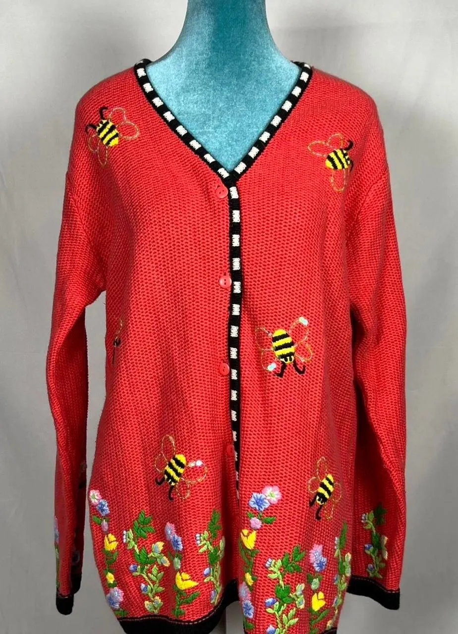 Buzz into charming vintage style with this cheerful cardigan from The Quacker Factory! This bright coral/red cardigan features delightful embroidered bumblebees and a detailed garden of flowers along the hem. The long-sleeve, button-front cardigan is framed by sharp black trim with a black and white checked detail along the placket and V-neckline. Made from a comfortable blend of 55% Ramie and 45% Cotton, this whimsical piece is perfect for cottagecore, novelty knit collectors, or statement spring layering. Details: * Brand: The Quacker Factory (Vintage) * Size on Tag: M * Color: Coral/Red with Black Trim * Material: 55% Ramie, 45% Cotton * Features: V-neck, Button front, Embroidered bees and flowers, Black & white checker trim Measurements (Laying Flat) * Pit to Pit (Bust): 21.5” * Sleeve Length: 23.5” * Length: 28” #quackerfactory #noveltyknit #vintagecardigan #cottagecore #vintage