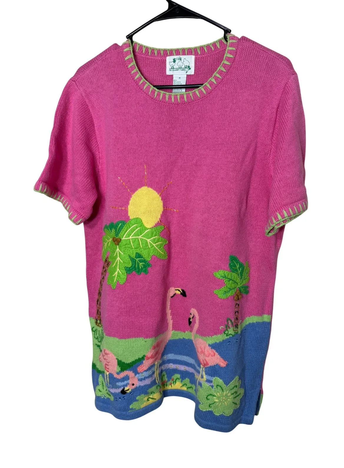 A vibrant pink knit sweater top adorned with a tropical scene from The Quaker Factory. This piece features short sleeves and a crew neckline, both finished with a contrasting lime green trim. The front showcases an embroidered and appliquéd design of palm trees, a radiant sun, and playful flamingos in a serene body of water. The back of the sweater has a subtle palm tree detail near the hem. It's also long enough to be worn as a dress. Material: ramie, cotton Theme: Tropical, Colorful Sleeve Length: Short Sleeve Type: Sweater Fabric Type: Knit Season: Spring, Summer Keywords: Knitwear, Tropical, Summer, Vacation, Resort, Novelty, Embroidered, Applique, Coastal, Bright, Fun !!!Please See Measurements vintage sizes run smaller than modern sizes!!! Measurements Length:29 1/2 in Pit to Pit:22 in Arm Length:10 in