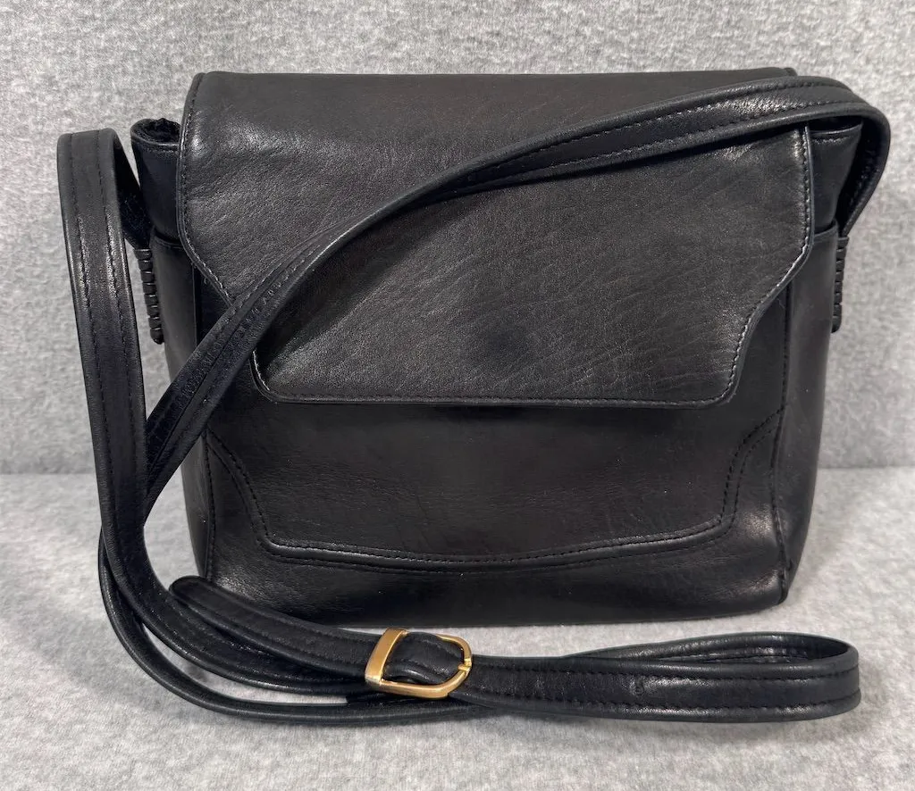 The Tignanella crossbody bag is crafted from genuine leather and comes in a sleek black color. It features a snap closure and multiple pockets for organization. The bag is made from extremely soft leather with an adjustable strap for comfort. pre-owned in excellent condition. Keywords: Tignanella, crossbody, leather, black, women's bag, adjustable strap, multiple compartments, flap closure, pre-owned, China. Brand: Tignanella Exterior material: Genuine Leather Style: Crossbody Exterior color: Black Department: Women Closure: snap Country of origin: China Features: Adjustable strap, Multiple pockets