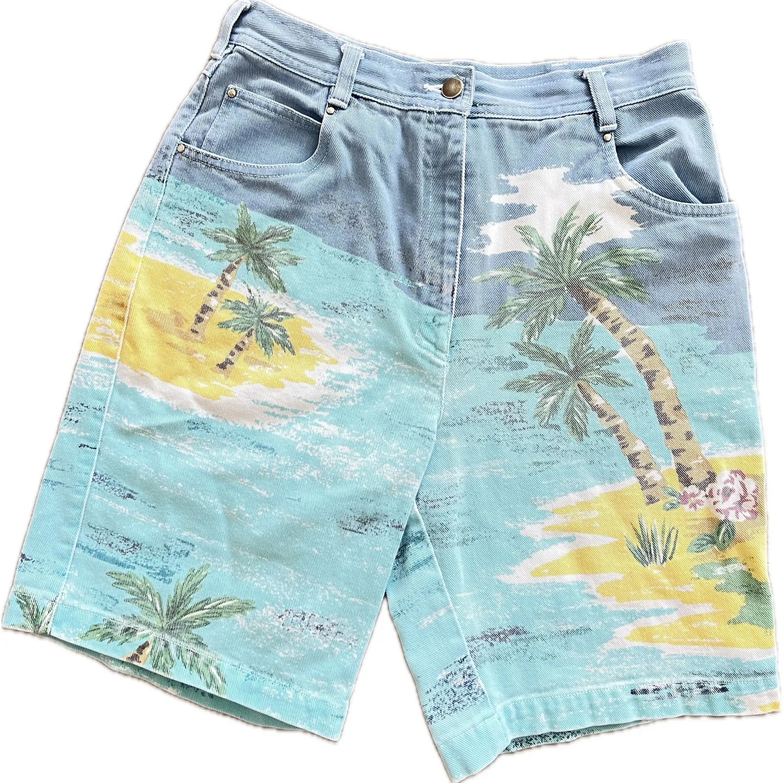 Excellent condition No Flaws Size: Measurements Taken Lying Flat Waist: 14.5" Inseam: 9" Length: 20" These vintage Together denim Bermuda shorts are a unique find! Featuring a high-waisted design and a vibrant Palm Beach tropical print, these shorts are perfect for adding a fun, retro touch to your wardrobe. The size 8 fit is ideal for a comfortable and flattering look. Don't miss out on these stylish and eye-catching shorts!