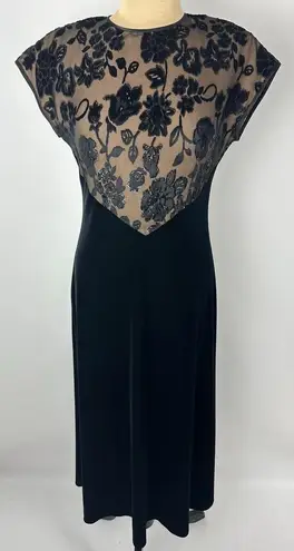 Vintage Jeffrey & Dan Evenings by Tom Barra Gown Size: 8 Features: Black Velvet Floral Upper Bodice w/ Nude Panel Underneath Short Sleeves Back Zipper Floor Length Excellent condition. No rips, holes, or stains. Measurements: Armpit to armpit: 18 inches Waist: 32 inches Length: 52 inches