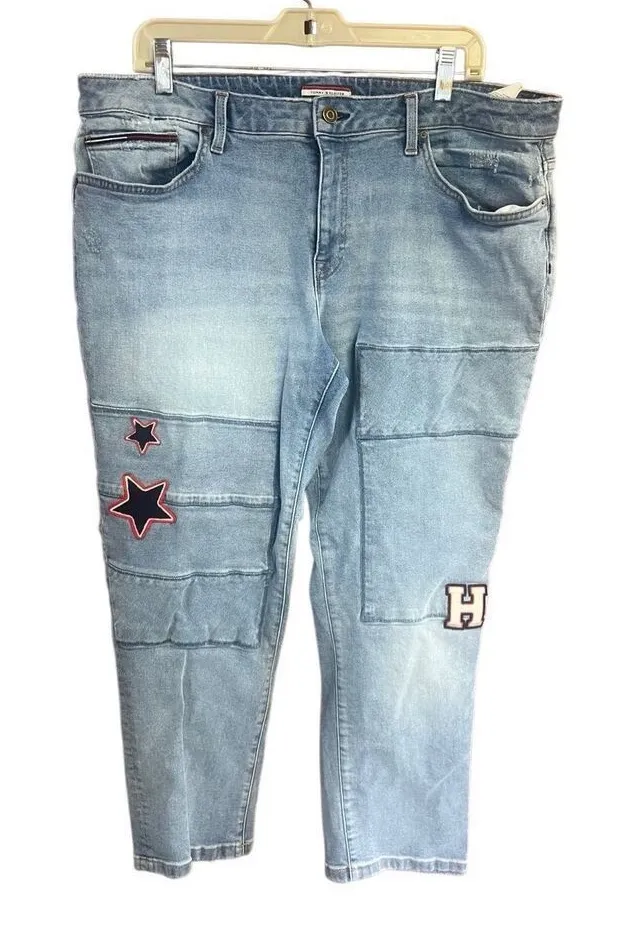 Vintage TOMMY HILFIGER Jeans Womens 16 Blue Boyfriend Straight Patches 90s Y2K