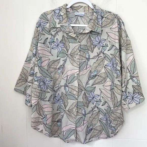Add a touch of the tropics to your wardrobe with this vintage button-up shirt from Sweet n Sassy (*FLAW see below*). Featuring a vibrant floral and bird print, this shirt is perfect for summer days. The collared neckline and casual sleeves give it a basic style that is both versatile and comfortable. Made from a blend of polyester and cotton, this shirt is lightweight and breathable, ensuring you stay cool in the heat. The 3/4 sleeves and plus size fit make it suitable for any occasion, from a casual day out to a more formal event. Don't miss out on this unique piece that will add a touch of bird-themed charm to your wardrobe. Good pre-owned condition* *FLAW small stain on back shoulder, hard to see, shown in multiple photos Size 40 (Approximately modern 2XL/3XL) Please check measurements to ensure correct fit Approximate measurements: Armpit to armpit 26 inches Length 29 inches Please see photos Style: Retro Fun Colorful Hawaiian Boho Bohemian Hippie Chic Summer Spring Easy Casual Breezy Beach Beachy Coastal Grandma Vibe Vacation Travel Resort Wear Concert Music Festival Garden Party Cottage Cottagecore Grandmacore Grannycore Thank you for looking! I love accepting all reasonable offers. ~~ I love saving clothes that have been discarded and finding them new homes. I ship as soon as I can, and use recycled materials/minimal plastic in my packaging. I hope you love your new-to-you item! ✨