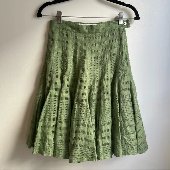 Fabulous vintage Umberto Ginocchietti green linen circle skirt, size [vintage] EU 40 or [modern] US 4. Ginocchietti was a fabric supplier to some of the worl'd most important fashion houses, and this piece shows us why. Made from a gorgeous green linen with a woven peekaboo mesh print that is unusual and difficult to produce. The mesh adds structure to the linen, which is what in part allows this skirt to have the volume and structure it does. The skirt is also lined to an almost crinoline effect. Made in Italy. This seems like an earlier piece of his, produced well before his foray into knits, maybe late 70s? An educated guess! Size zip and button closure. Lined. As with all vintage pieces look at measurements for a correct fit: 26" waist, 22" top of waistband to bottom hem. In Excellent, flawless condition. Appears to have never been worn. No rips, tears, repairs, or alterations. No stains or fading.