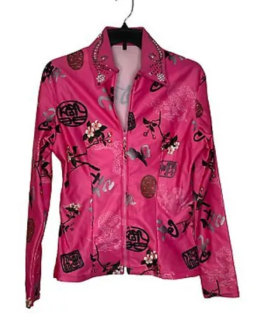 Brand- Unbranded Size- Small?- Size tag is not present. Please use measurements below for exact sizing. Color- Pink With Floral Asian Pattern Stretch Measurements: Armpit to armpit- Under the arm measurement- 19" Shoulder to shoulder- Shoulder seam to shoulder seam- 17" Length- From bottom of collar to the end of the jacket- 24.5" Sleeves- From shoulder seam to end of cuff- 24"